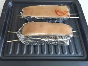 肉的部位包裹上锡纸,皮露出。放入预热到220度的烤箱,烤40分钟。
