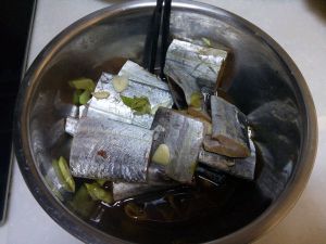 切段清洗干净,放入葱姜蒜、生抽、料酒腌制30分钟
