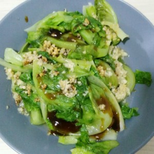 水烧开,放适量花生油,放生菜,用筷子搅拌后,水再次烧开后熄火,菜沥水后放入碟中,倒入适量蚝油。花生油烧开,放蒜茸搅拌微黄后熄火。将蒜茸滚油倒入菜面,吃时用筷子搅拌均匀即可。