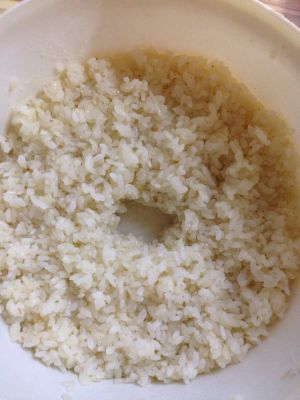 蒸好的米等它凉成常温不烫手再将酒曲拌进去,将糯米压紧中间留个小洞。