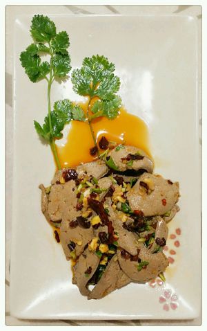 猪肝切薄片,开水中焯变色看不到红色即可。约大火三分钟,别太久会老的。