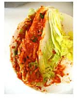 取无油的一个大盘子,拿起1/4颗腌好的白菜,将叶子平铺,在每片白菜叶的正反面均匀涂满辣白菜酱料。