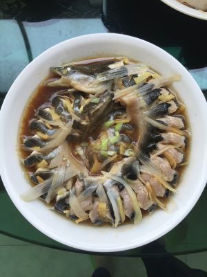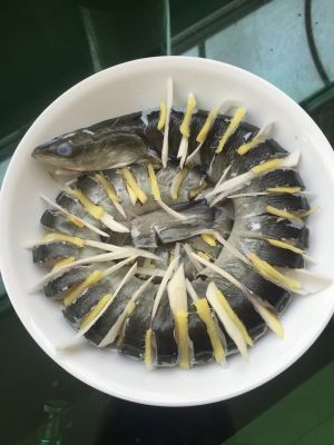 白鳝沸水烫洗去黏液(很重要),切段时案板上放根筷子和鱼并排,就不会切断了,切口放葱丝姜丝,将酒,豉油,蚝油倒入腌制一会。上锅蒸12分钟,鱼大需要延长时间。