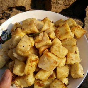 妈妈自己蒸的馒头,横着切几刀竖着切几刀,切成大约1.5厘米宽的小方块