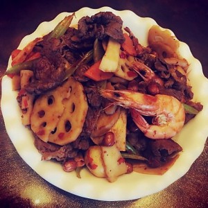 牛肉、鸡胗和虾清洗处理后放入洋葱、葱、姜、蒜料酒盐抽腌制,料入味起锅,爆锅后下肉类和虾一起炒半熟