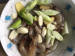 鲜活基围虾清洗后去掉虾线,放进碗中,加入葱、姜、蒜、料酒、盐,腌半个小时去腥入味