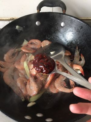 放入一勺豆瓣酱,快速翻炒