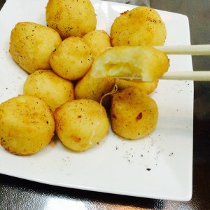 土豆沥干水后压成泥,加入一半的蛋液、6勺的淀粉、和少许盐和胡椒
