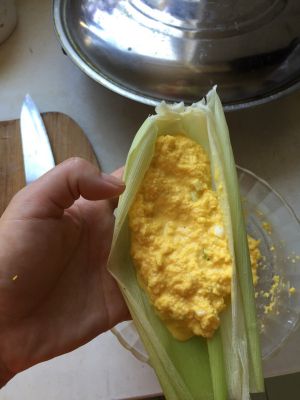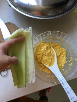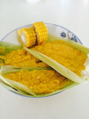 挑选些大一点干净的玉米叶,把玉米浆盛到玉米叶上。
