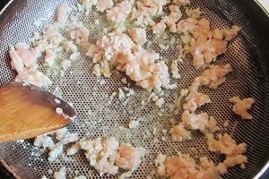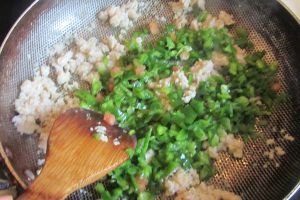 将锅烧热, 倒入少量的橄榄油, 下入腌好的肉末煸炒;