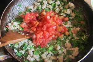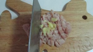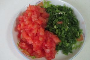 将西红柿切成小块,去除里面的芯, 再将它剁成小粒;