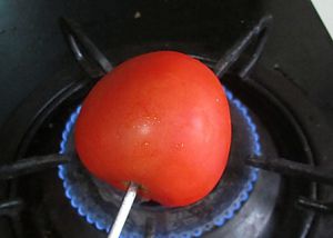将西红柿用筷子插入底部, 放在火上烤, 均匀的转动, 看到皮破了关火;
