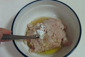 将肉馅中加入适量盐, 生粉,生抽, 油, 顺着一个方向搅拌均匀, 腌制十分钟; 个