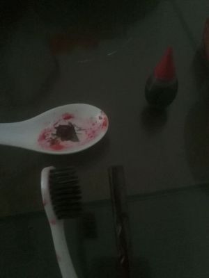 将包好馅的面团捏出一小尖,然后用刀背压条桃痕,用支干净牙刷的粘点色素在筷子上弹三下,过后再观察颜色的深浅。