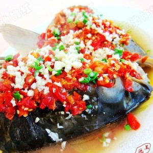 用葱丝,姜丝,蒜片垫底,把鱼头放上面,鱼头上铺剁椒,上锅蒸20分钟(根据鱼头的大小定吧,我用的鱼头比较大)