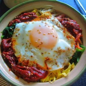锅中倒少许油,煎一个溏心荷包蛋。煎好的溏心荷包蛋放到菜丝上。