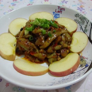 倒出多余的油,锅里剩下少数油炒汁。炒香之后倒入之前炸出过的茄子,继续翻炒2-3分钟起锅,撒上葱,苹果切片摆盘即可。