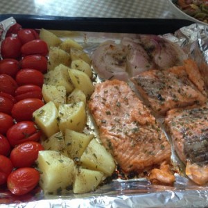 三文鱼洗净,切大块后用黄油稍微煎一下,表面煎熟即可,同样放入烤盘。
