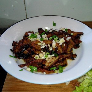 把煎好的茄子放入另一个炒锅放入酱油 面酱,水,糖。翻炒片刻出锅。不要太久。没有太多汤汁,不要放盐噢,已经比较咸了。