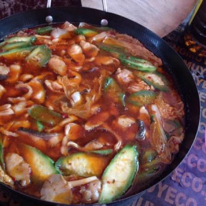 起小火,把锅烧热,倒油,把大包得调味倒下去,轻微炒几下,放入适量得清水,把水煮开,先把鱼骨放下去,(买来得素菜如果是难熟得,比如冬瓜,黄豆芽)也可以放下去了,如果怕腥可以加点生姜。素菜好的差不多了,可以放鱼片了,鱼片不用煮太久了,变色了就可以把火关掉。这样肉很嫩得。最后可以淋麻油下去了。注,吃的很辣可以吧辣椒调料包全部放。趁热吃噢