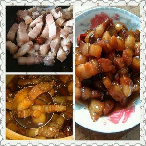 翻炒好后,加入水、酱油,草果,八角,姜一块,干辣椒一个,少许红酒,煮到肉熟水分干即可。