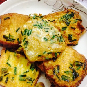 把鸡蛋打碎 搅浑放些葱 等 把馒头片放入俩边都要粘到鸡蛋