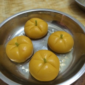 搅拌好,拿一小块弄成圆行,用勺子或牙签压线,最后放点绿色的东西在上面。拿去蒸熟就可以吃了