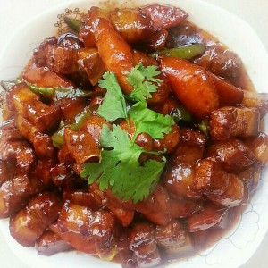 大火收汁,乘出,放几片香菜叶,好啦,吃饭咯。
