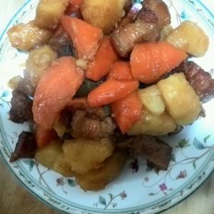 放入冰糖化开炒均放姜大料炒香放料酒酱油炒均匀放水煮沸,放土豆和胡萝卜中伙炖到水少了收汁出锅。