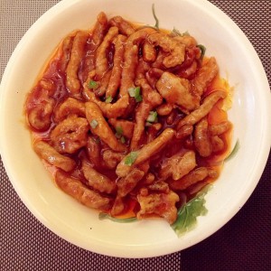 将里脊肉洗净,切成小拇指粗细的条状,用料酒、盐、鸡精、淀粉腌制25分钟
