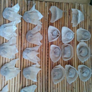 这是我包好的,三种样子!往碗里放上少许紫菜,虾皮,盐,煮好后先往碗里放点汤,然后放入煮好的馄饨就好了!