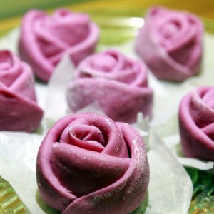 将紫薯去皮切块煮熟后压成泥,晾凉备用。把面粉、紫薯泥、干酵母放入盆中拌匀,加水揉成光滑面团。