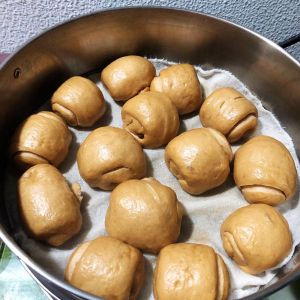 开启面包机发酵模式,我花了1小时,发酵至2倍大,也可以用蒸锅,把水稍微加热一下,然后放在蒸锅上发酵。