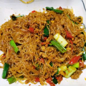 下粉丝和调好的酱汁(适量的生抽,豆瓣酱,醋,加少量的水拌匀),调中火翻炒,拌匀即可