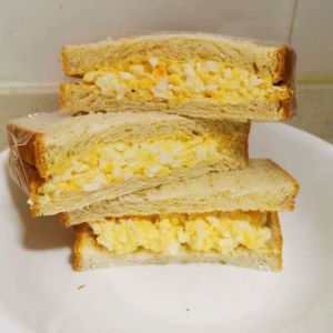 垫好保鲜膜,涂抹在吐司上,这里用的是全麦面包片,也可以再加生菜或者番茄片等食材