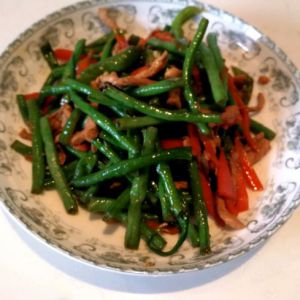 闻到香味倒入切好的豇豆、辣椒和胡萝卜。