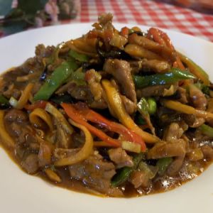 开大火,依次放入胡萝卜丝和青椒丝翻炒几下后,再放入黑木耳丝翻炒