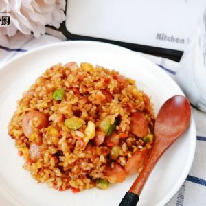 另起锅,倒入适量油,炒饭的油不要太少了,至少要比平时炒菜时放的油多一倍。油烧热后先下香肠炒熟,再放胡萝卜丁和黄瓜丁,炒匀炒熟。