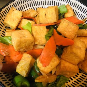 煎至金黄后把豆腐往一边放放、加入葱、蒜、胡萝卜、柿子椒、翻炒一下