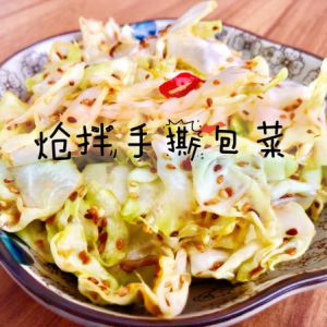 手撕包菜,点缀小米辣,加入味极鲜、醋,盐。