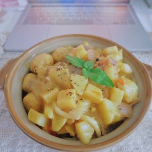 洋葱、土豆、胡萝卜切块,热油下洋葱,煸香后下土豆和胡萝卜,翻炒一会儿后加入没过食材的水,关盖焖煮至土豆软烂。