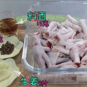 凤爪放入料酒花椒生姜腌制,把凤爪连同调料一起倒入开水锅中大火煮6分钟,然后立即捞出放入冰水中。