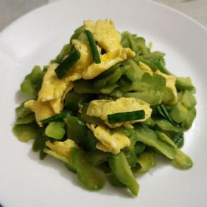 第5步:起锅烧油倒入苦瓜,加入盐,鸡精,想吃清淡点的就不用加油,因为刚刚炒鸡蛋还有很多油在锅里