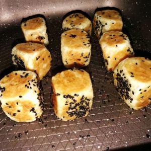 两年粘上芝麻,放入平底锅,中火烙,烙成六面(就是翻面),大概一面六七分钟,中间可以翻看,不要糊了