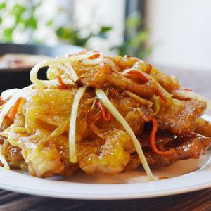 然后加入胡萝卜丝、葱丝和姜丝,翻炒均匀,好吃的锅包肉就可以出锅了,赶紧装盘吃起来吧。