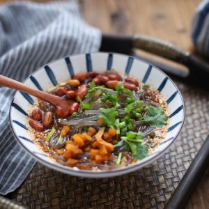 把粉条捞出来放到碗里,加花生米,葱花,再根据个人喜好放榨菜和香菜。