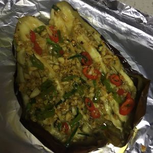 锅内倒油烧热 下蒜 炒香 下红绿辣椒 倒生抽 蚝油 辣椒面 茄子表面花开 淋于茄子表面