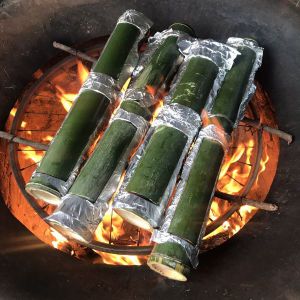 大米,糯米,胡萝卜,玉米粒,盐适量 均匀拌好,准备装竹筒