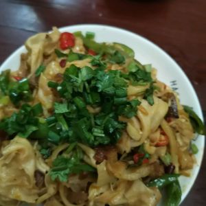 豆皮用开水泡一下,2分钟就可以了,捞出冲洗干净,撕成小块,辣椒切段,蒜切末,子姜切丝,可以不用子姜,我是因为家里剩一块,就用了