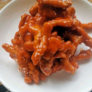 油温至九成热(就是快咕噜咕噜滚起来时),把肉条重新下入,复炸至金黄色,捞出。